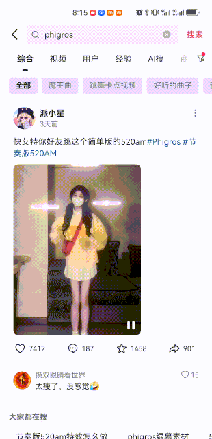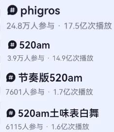 他们真的都认认真真给视频打上了《Phigros》的TAG,以至于现在你在抖音搜索,会发现无论是原版的“520AM”,还是“520AM节奏版”,又或者是任何与这个梗相关的其他TAG,总播放量都不如“Phigros”这一TAG。