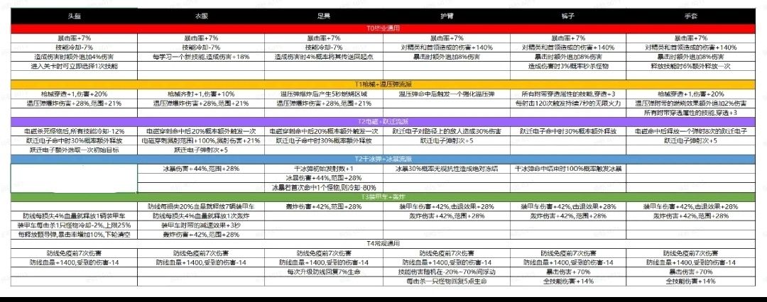 通用:秒杀,传送,暴击百分比伤害,技能穿透(对枪械生效),冷却(这个对枪械也是生效的),暴击(注意不是暴击伤害),对精英和BOSS加伤,枪械齐射,枪械穿透,防线免疫伤害次数