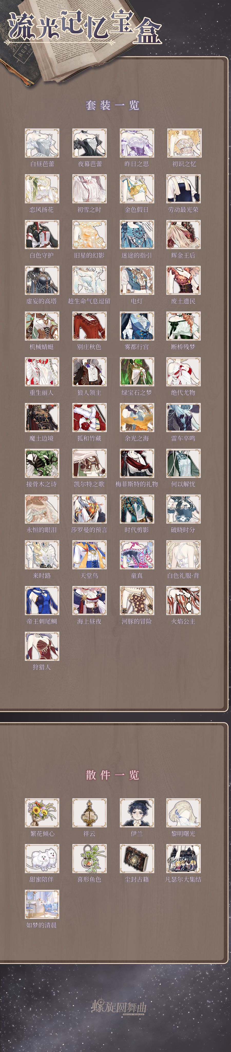 套装部件「白昼芭蕾」「夜幕芭蕾」「昨日之思」「初识之忆」「恋风扬花」「初雪之时」「金色假日」「劳动最光荣」「白色守护」「旧星的幻影」「迷途的指引」「辉金王后」「虚妄的高塔」「趁生命气息逗留」「电灯」「废土遗民」「机械蜻蜓」「别庄秋色」「雾都行宫」「断桥残梦」「重生丽人」「狼人领主」「绿宝石之梦」「绝代尤物」「魔土边境」「狐和竹藏」「余光之海」「雷车卒鸣」「接骨木之诗」「凯尔特之歌」「梅菲斯特的礼物」「何以解忧」「永恒的眼泪」「莎罗曼的预言」「时代剪影」「破晓时分」「来时路」「天堂鸟」「童真」「白色礼服·背」「帝王刺尾鲷」「海上昼夜」「河豚的冒险」「火焰公主」「狩猎人」
