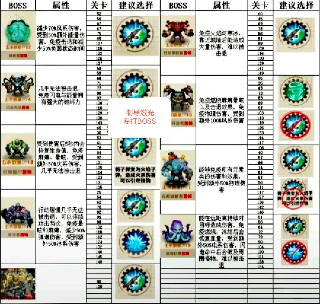推图过程中我们会遇到各种各样的怪物,有的怪物对火焰抵抗高,但是对雷电抵抗低,有的反之。还有的怪比如电锯怪,他的属性是无敌3秒,就需要减速或者冰雹的冰冻来打他。