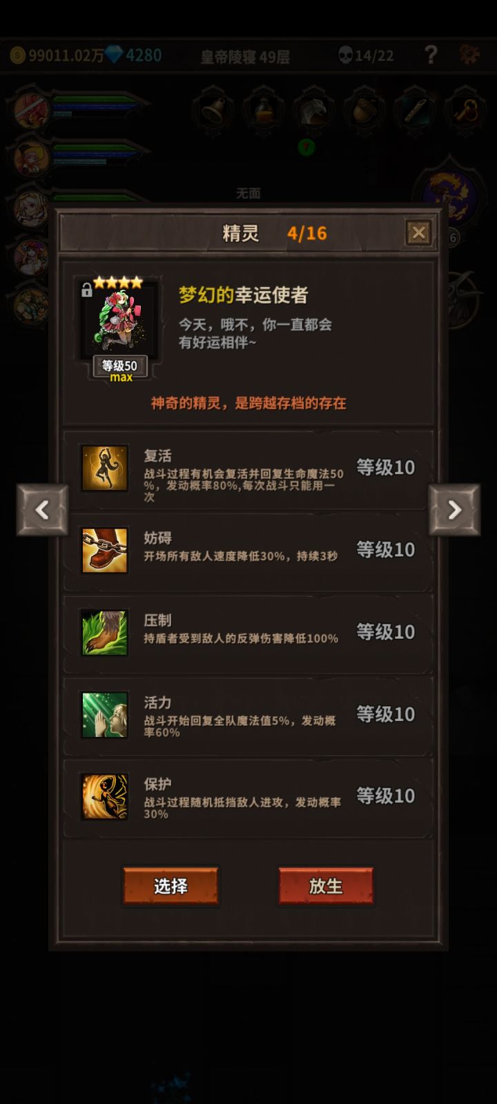 毕业精灵:至少要两只,①妨碍,压制,保护,复活,活力②三星锻造。有条件可以刷③妨碍,觅食,活力,复活,储值(刷金币用,但是后期没必要)④净化,殿后,妨碍,保护,复活(梦境净化debuff,但是①已经够用了,可要可不要)