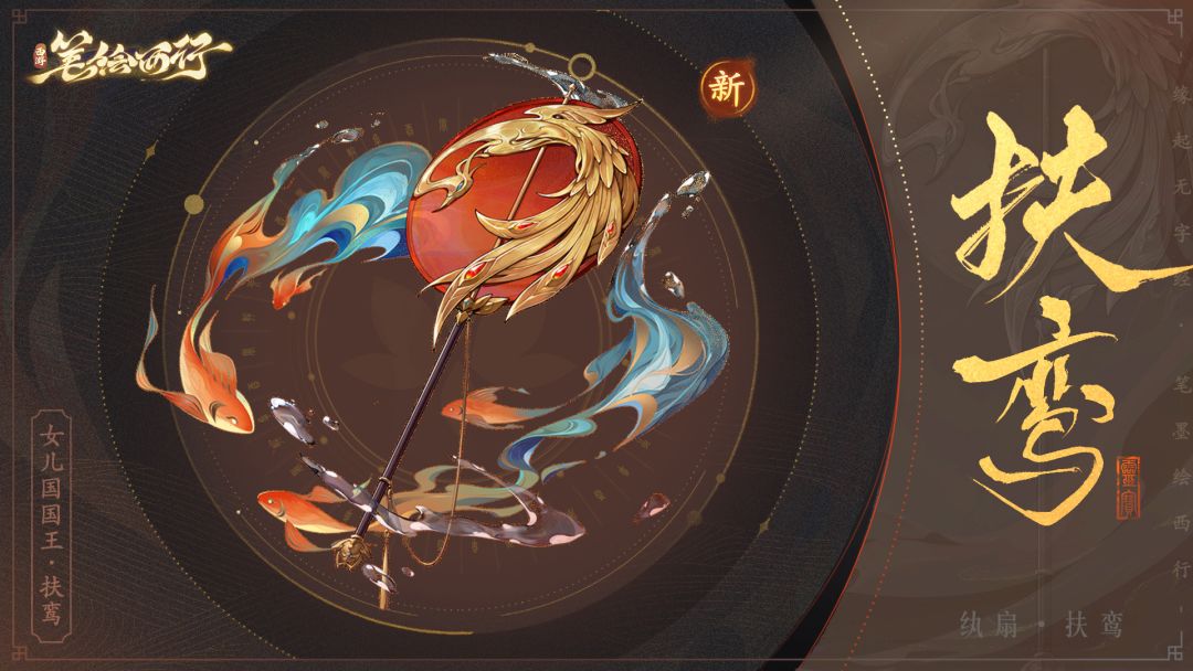 女儿国国王所持纨扇。古时曾有鸾鸟负伤飞落女儿国,国王闻其哀鸣,不忍见其死,遂举国力救之。鸾鸟养伤数月痊愈,为表谢意,鸾鸟把万翎国的祝由之术传授给了女儿国。在女儿国河巫的研习下,将这祝由之术变为更适合女儿国民众使用的治愈之法。而这鸾鸟的图腾,也从那时流传至今。