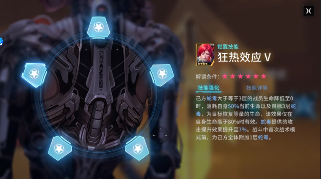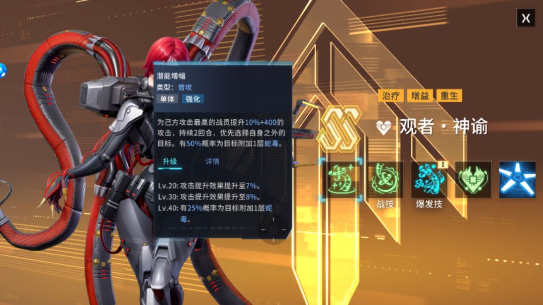 观者·神谕普攻觉醒被动也是辅助功能:己方蛇毒大于等于3层的战员生命值降低至0时,消耗自身50%当前生命值以及目标3层蛇毒,复活该战员并恢复等量生命值,该效果仅在生命值高于80%有效。每层蛇毒提供的攻击效果提升至7%,战斗中首次战术模式前,为己方全员附加一层蛇毒。