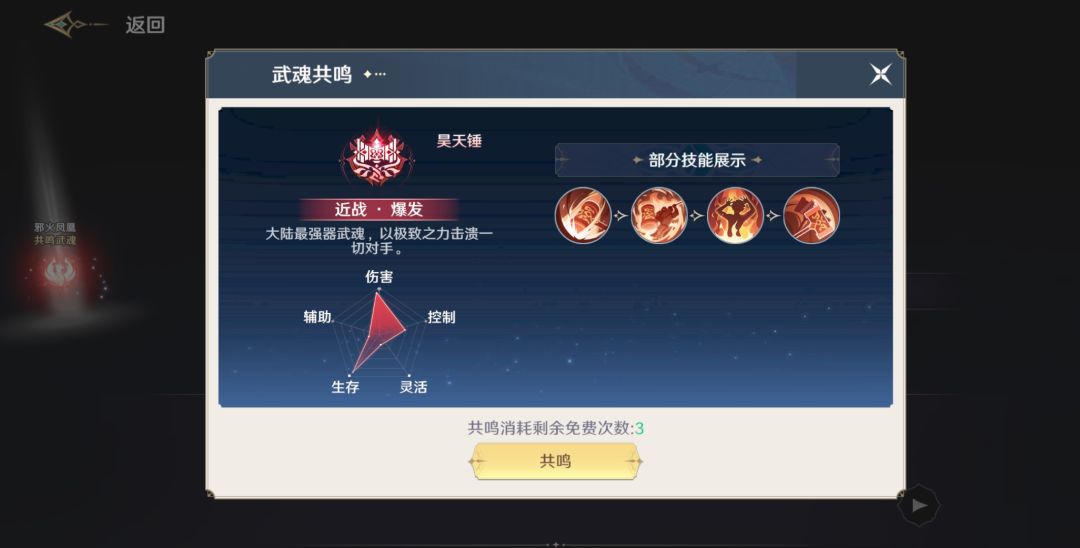 玩家在天斗城中找到NPC-武魂共鸣接引人-吉赛尔,进入神秘空间之后,即可共鸣全新武魂--昊天锤!昊天锤武魂职业特性为:近战爆发,大陆最强武魂,以极致之力击溃一切对手。