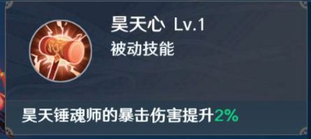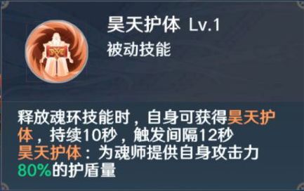 释放魂环技能时,自身可获得昊天护体,持续10秒,触发间隔12秒。昊天护体:为魂师提供自身攻击力80%的护盾量。昊天心:昊天锤魂师的暴击伤害提升2%。
