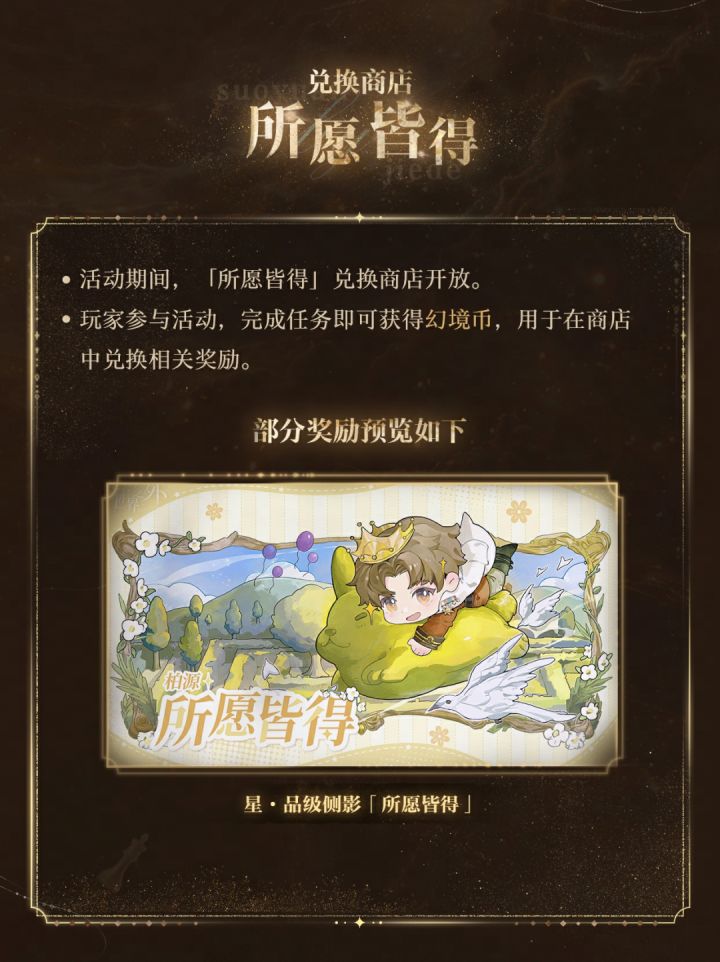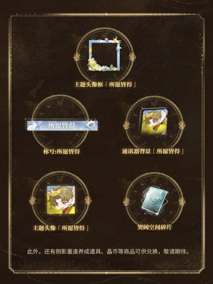 1.活动可兑换获取星级侧影「所愿皆得」、主题头像框「所愿皆得」、主题头像「所愿皆得」、通讯器背景「所愿皆得」、限定称号「所愿皆得」、契阔空间碎片x10、侧影重逢养成道具等。