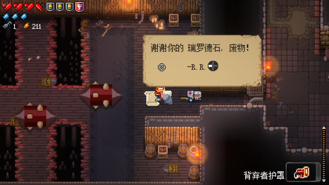 依稀记得损失最为惨重的一集,出于想试一试新主动道具的伤害与功能的心思,便将我的S级主动瑞罗德石丢至门外,最后只余一张嘲讽感十足的黄纸飘落门外(如上图)。也是因此,丧失了最强主动的我,最终遗憾止步于Boss门前,于是同这个老鼠的梁子便结下了。不过还好,制作组获取也洞悉了玩家的心思,贴心地为玩家提供了暴打老鼠的方法,且提供了极为丰富的道具收益。