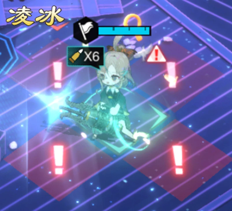 凌冰是一个随机点名技能,会随机点名三名器者,以他们所在位置的十字危险范围造成伤害