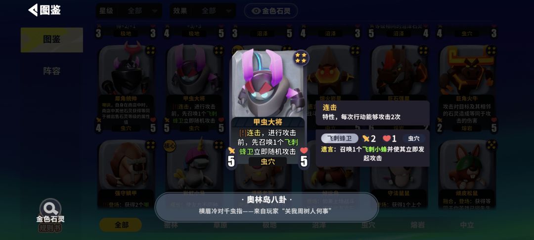 提醒一下,甲虫大将不放一号位,最好一号位放频率怪,甲虫大将融合螳螂拳后置,这样可以做到稳定出手甚至多次出手。