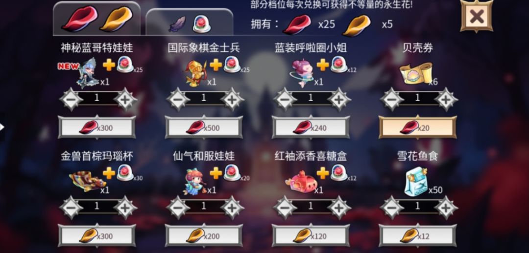 消耗收集到的两色花瓣可以兑换新鱼和其他奖励,兑换部分奖励还可以额外获得数量不等的永生花。