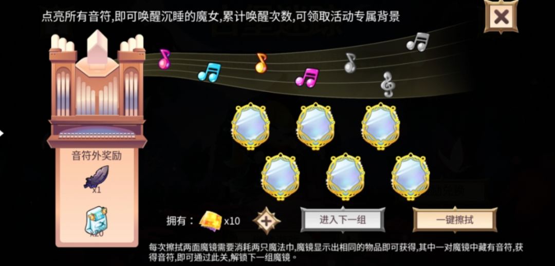 进入古堡后即可唤醒沉睡的魔女,使用魔法巾擦拭魔镜显示出相同的物品即可获得,找到藏于音符的魔镜即可获得音符进入下一关。点亮所有音符可以唤醒魔女,累次唤醒次数,可领取活动专属背景。