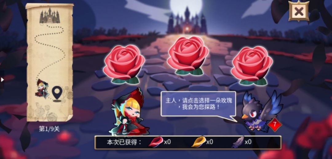 从玫瑰花中点击一朵玫瑰,乌鸦会帮助主人进行探路,前往古堡的路途上一共有9关,通过9关即可进入古堡。