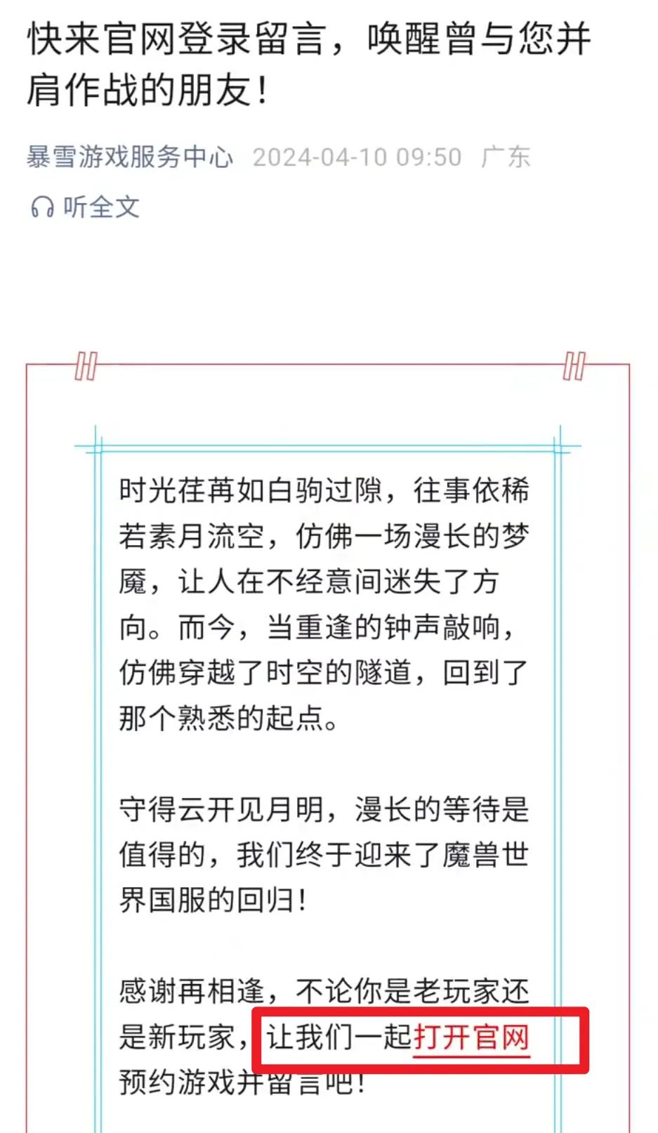 不仅如此,在暴雪游戏服务中心官方公众号的推文里,有一个“打开官网预约游戏”的超链接。