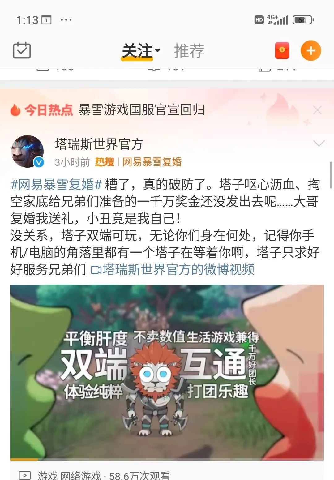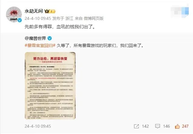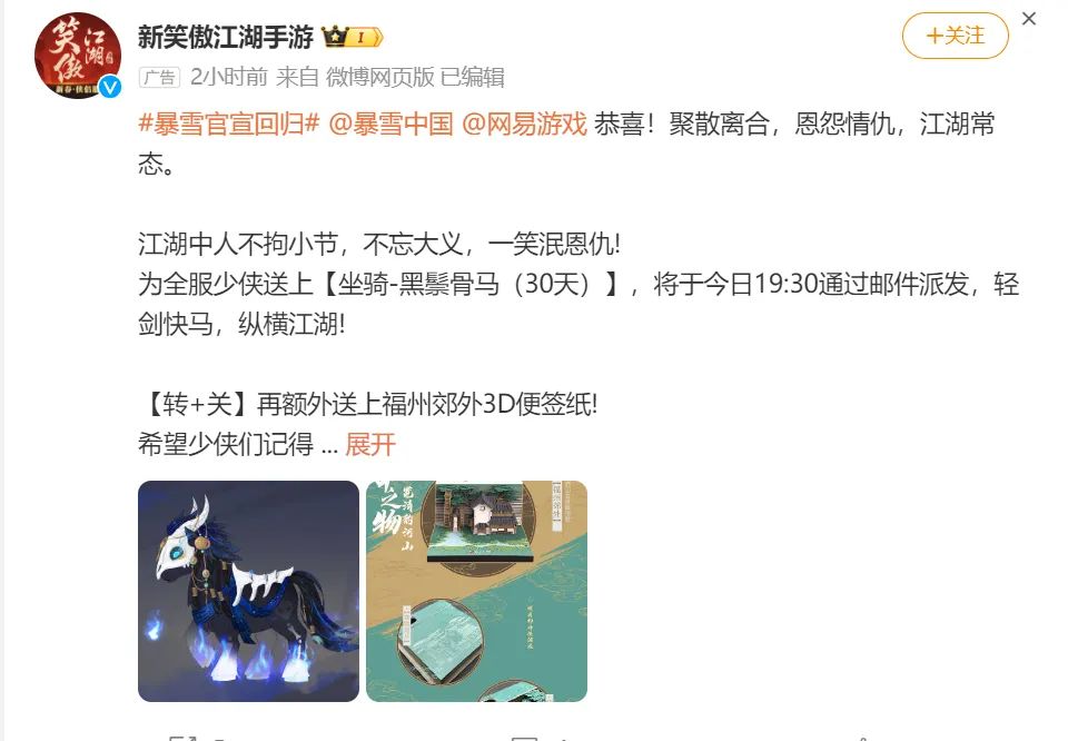 复婚了,但是没有完全复婚。之前暴雪网易离婚时已经蹭过一波热度的游戏这次肯定也不会放过天降的流量,《永劫无间》表示愿意出钱重铸当初被拆掉的血吼。
