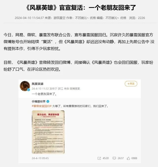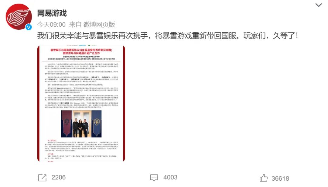 最后结果也并没有让玩家失望,4月10日上午,暴雪中国和网易游戏同时官宣,将重新合作,将暴雪游戏重新带回给国服玩家。