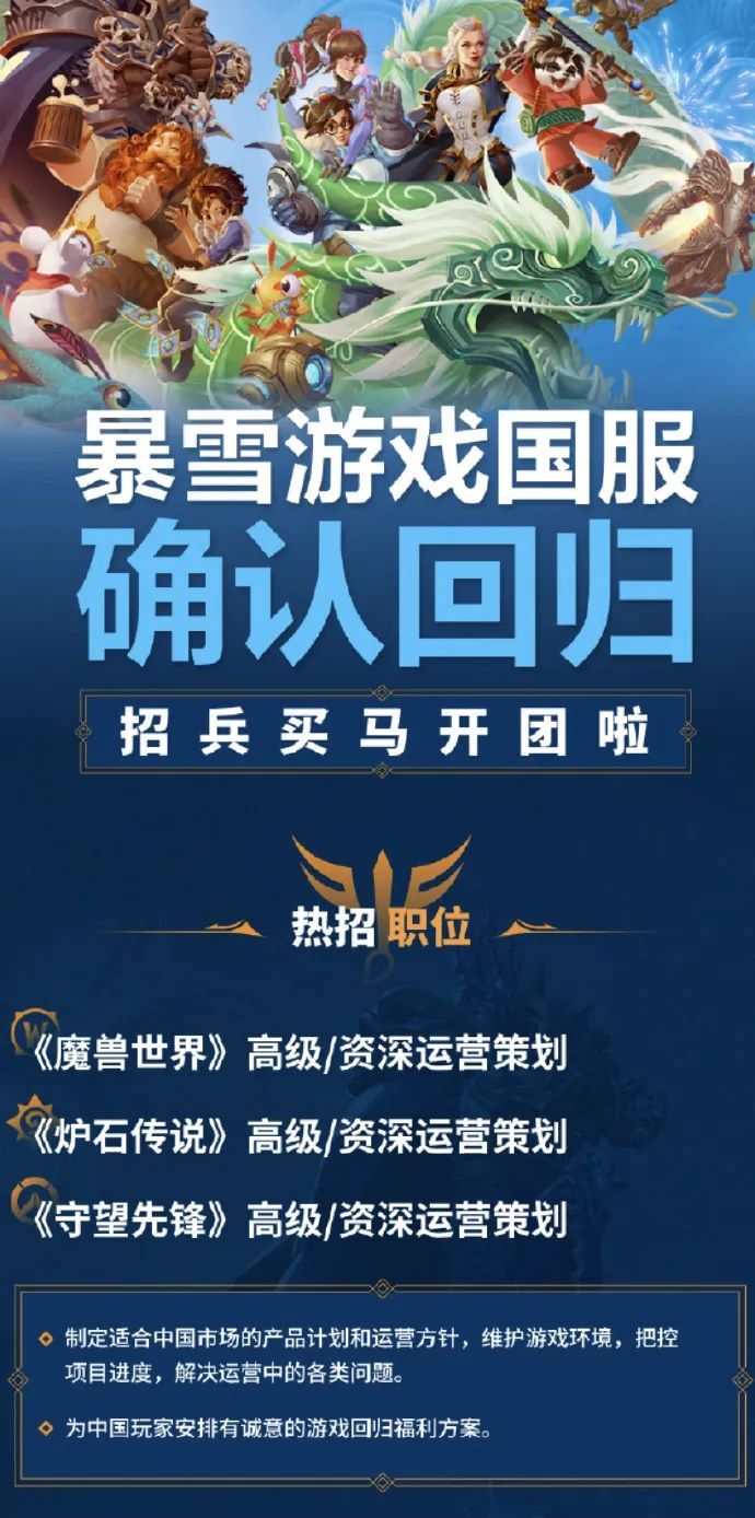 不过同样是回归,重视程度显然还是有区别的,在暴雪国服回归招聘公告的“热招职位”里,只提到了《魔兽世界》《炉石传说》《守望先锋》,看来《星际2》《风暴英雄》《暗黑3》的家庭地位是很明显了。