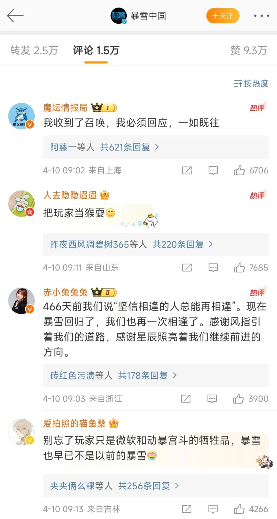 有趣的是,在暴雪中国官宣回归的微博评论区,最高热度的四条评论刚好分成了两派。
