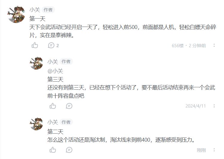 ⭐特殊奖励——连续三天讨论内容均为天下会武活动相关的盖楼,第三天奖励升级为元宝*500、招贤令*2