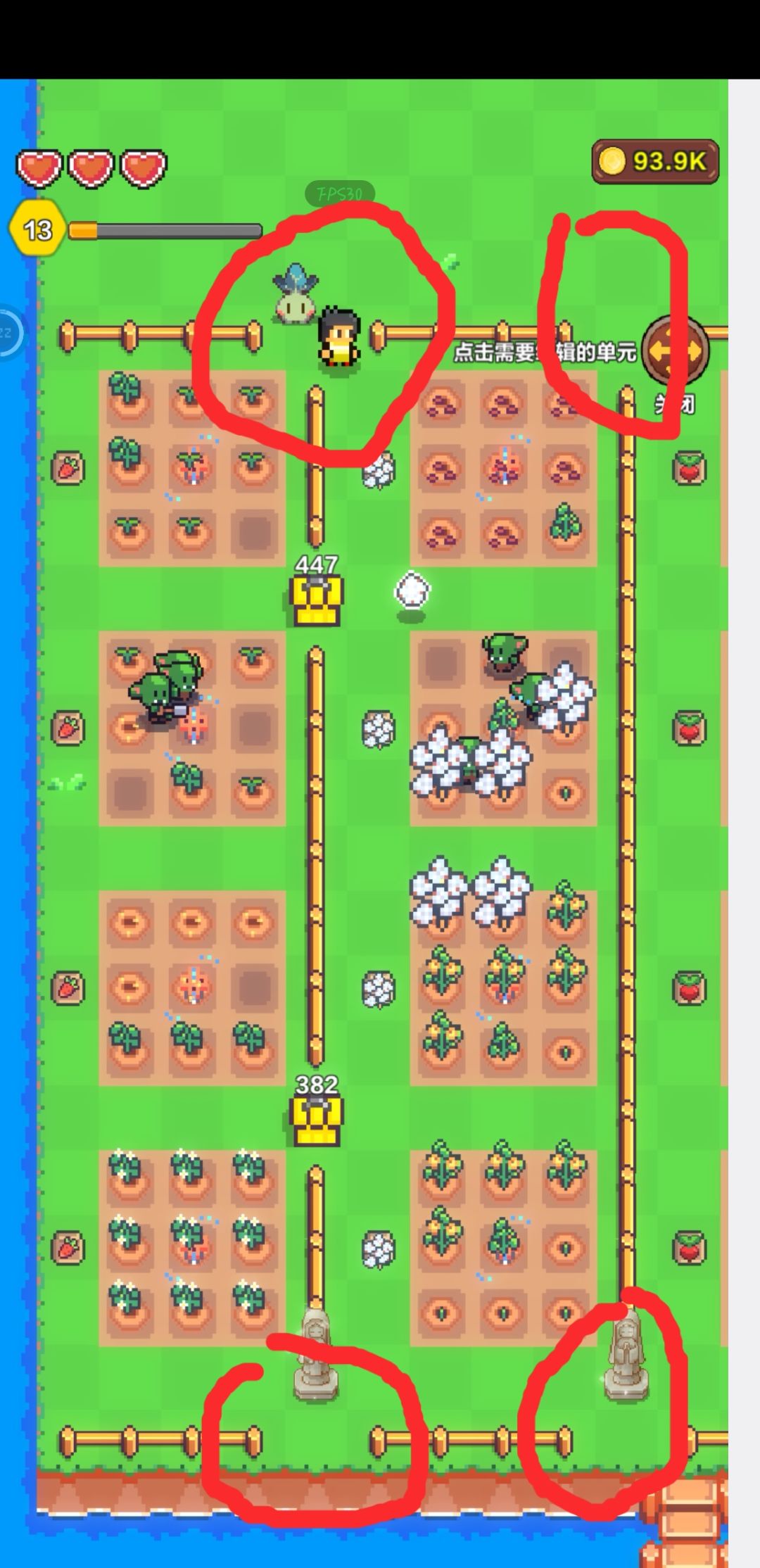 5、每块农田中间放置一个浇水器(图五位置)浇水器买的时不能直接放在田块中间,会显示红色,先随便放在一边,购买完在挪到田块中间就可以放置。
