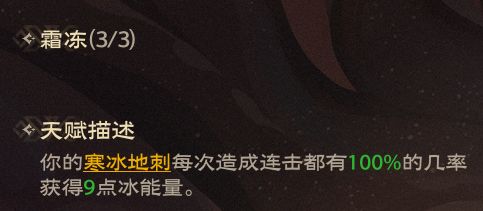 瞬发蓄能单体技能,默认键位为2,拥有水能量时,使用后消耗最多30点水能量转换成冰能量。点出“霜冻”天赋时连击有概率获得9点冰能量。
