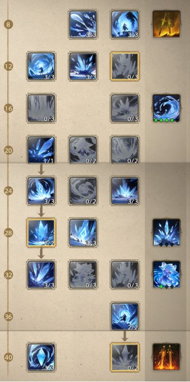 单体泄能高伤技能,消耗30/60/90点冰能量,生成1/2/3根冰锥攻击目标。在点出天赋“极寒冰锥”后会被极寒冰锥替代。