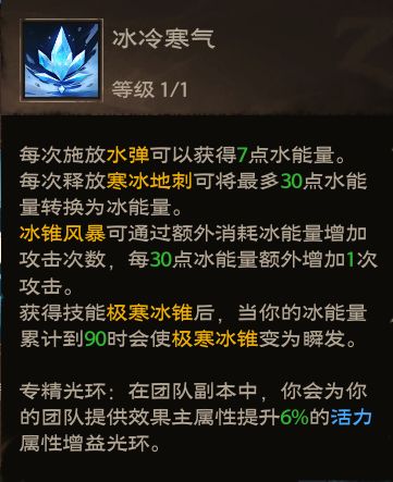 单体泄能高伤技能,有90点冰能量时可以瞬发,否则的话需要读条2秒才能施放。使用瞬发极寒冰锥可获得冰冷能量,消耗冰冷能量可获得冰能量,再次打出瞬发极寒冰锥。