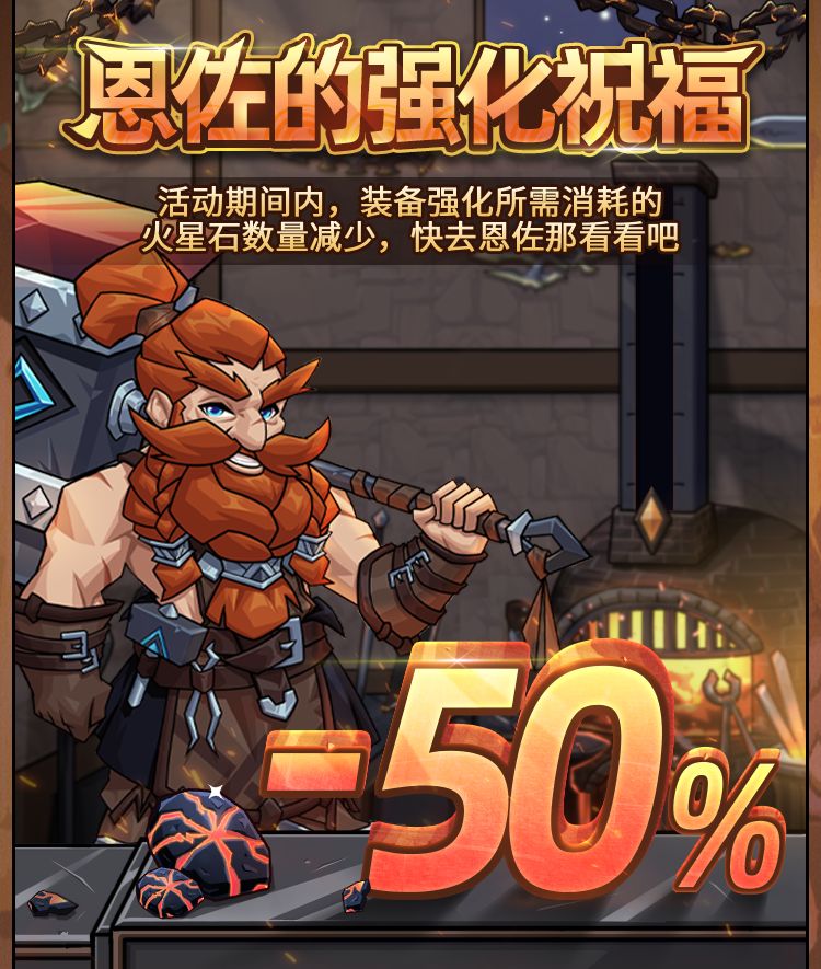 活动内容:活动期间内,提灯者在铁匠铺强化所消耗的火星石数量将会减半
