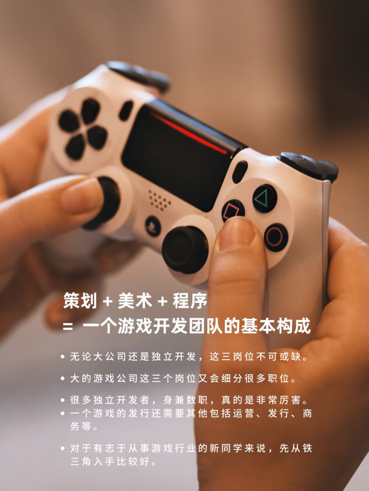 ❄️无论大公司还是独立开发者,这三个岗位不可或缺。大的游戏公司这三个岗位又会细分很多职位。当然很多独立开发者,身兼数职,真的是非常厉害。当然其他还有运营、发行、商务等等,但对于有志于从事游戏行业的新同学来说,先从铁三角入手比较好。