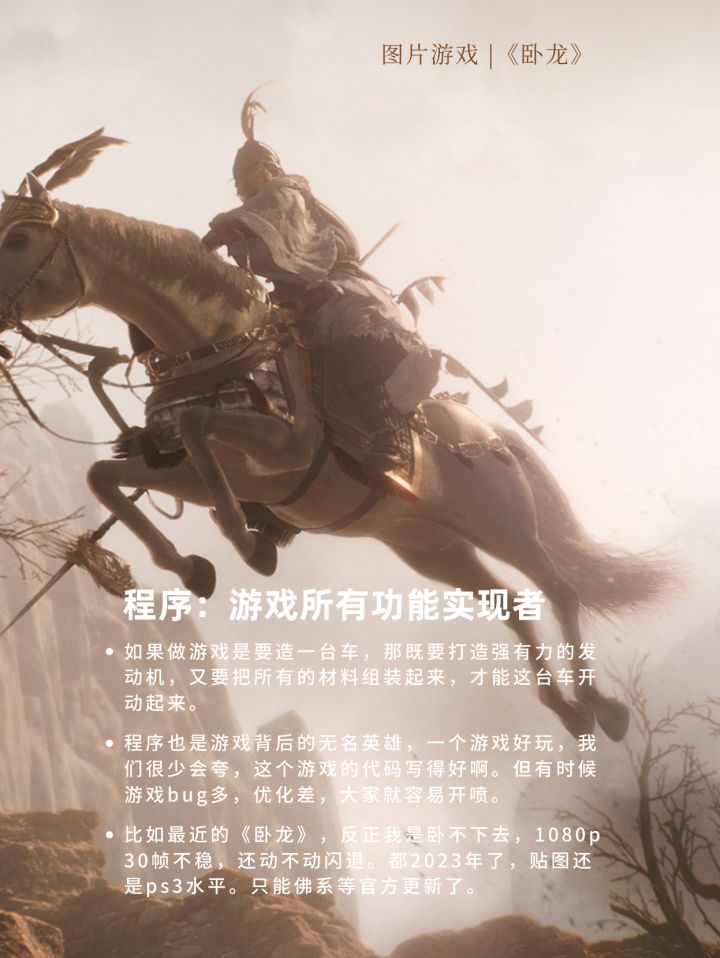 策划说了一大堆,但是程序大佬说:我们要科学编程!如果做游戏是要造一台车,那既要打造强有力的发动机,又要把所有的材料组装起来,才能这台车开动起来。程序也是游戏背后的无名英雄,一个游戏好玩,我们很少会夸,这个游戏的代码写得好啊。但有时候游戏bug多,优化差,大家就容易开喷。比如最近的卧龙,反正我是卧不下去,1080p 30帧不稳,还动不动闪退。都2023年了,贴图还是ps3水平。只能佛系等官方更新了。