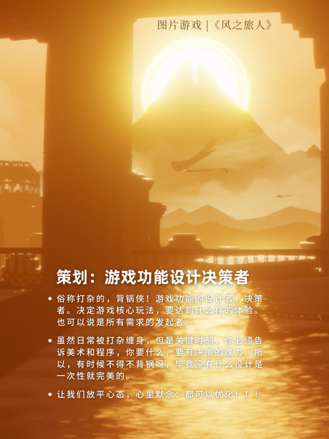 决定游戏核心玩法,要达到什么样的体验。也可以说是所有需求的发起者。虽然日常被打杂缠身,但是关键时刻,你必须告诉美术和程序,你要什么,要有决策的魄力。所以,有时候不得不背锅呀,毕竟没有什么设计是一次性就完美的。让我们放平心态,心里默念:都可以优化!!!