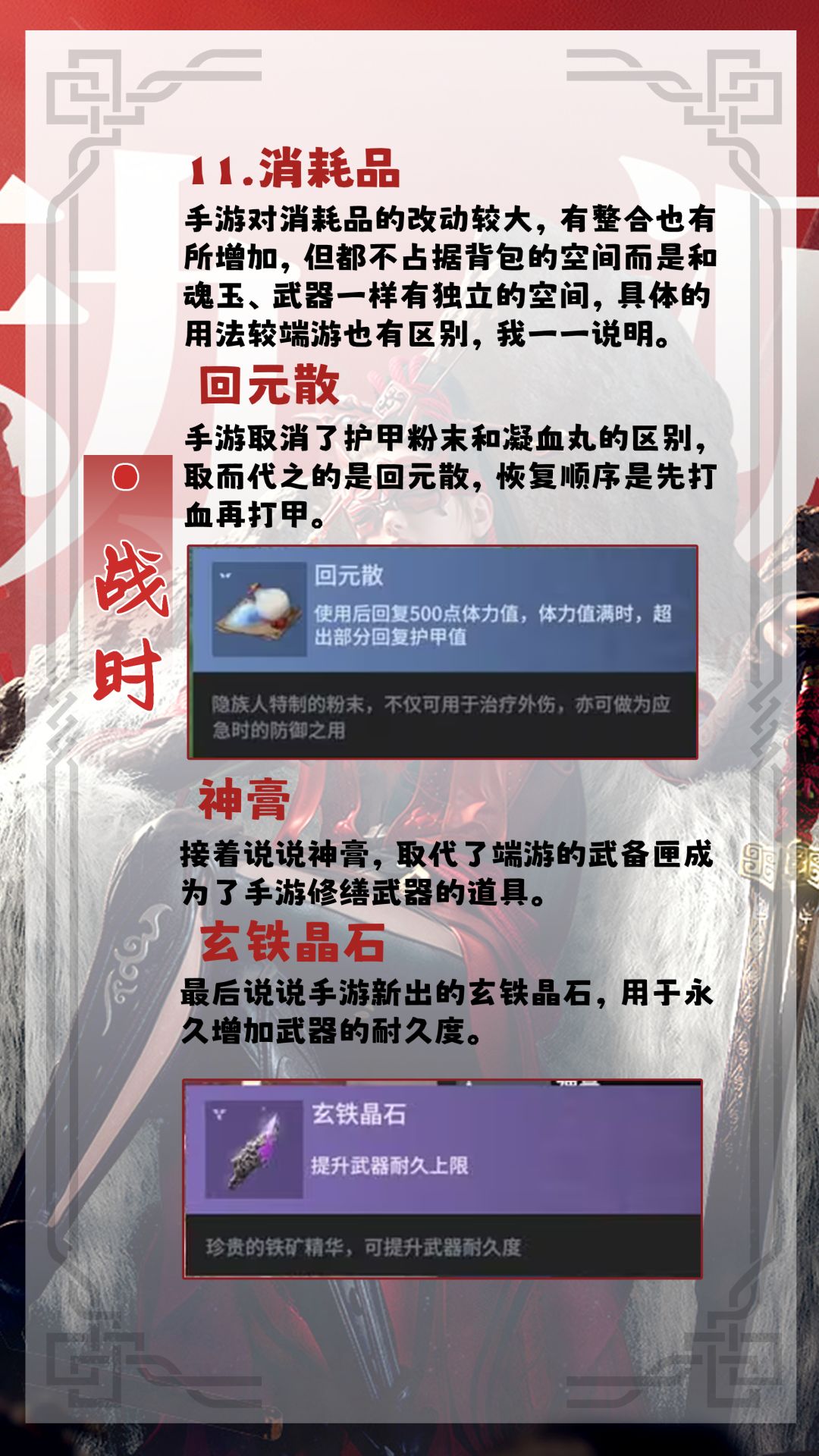 手游对消耗品的改动较大,有整合也有所增加,但都不占据背包的空间而是和魂玉、武器一样有独立的空间,具体的用法较端游也有区别。