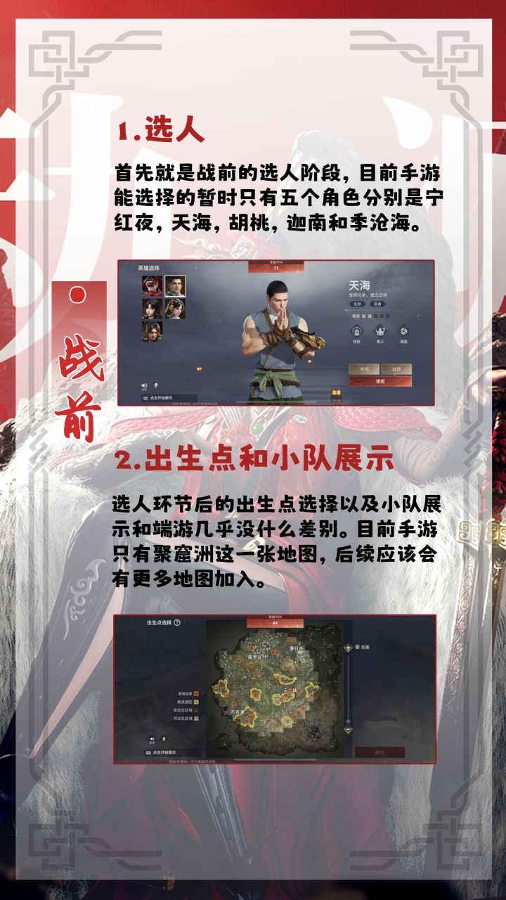 选人环节后的出生点选择以及小队展示和端游几乎没什么差别。目前手游只有聚窟洲这一张地图,后续应该会有更多地图加入。