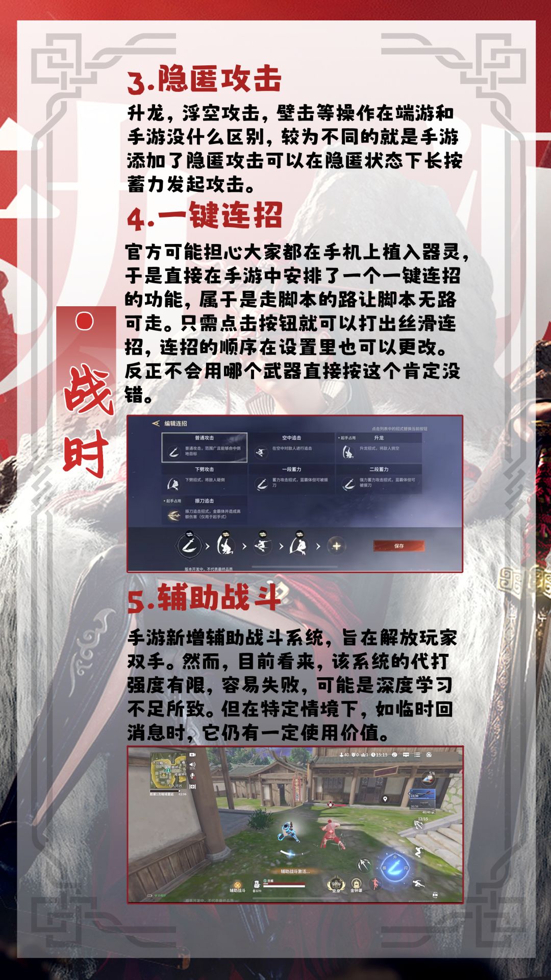 升龙,浮空攻击,壁击等操作在端游和手游没什么区别,较为不同的就是手游添加了隐匿攻击可以在隐匿状态下长按蓄力发起攻击。