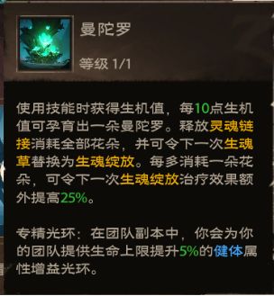 核心天赋:灵魂之力、欣欣向荣、强化守护魂火。对BOSS主目标释放灵魂链接后再挂上守护魂火,加上生魂绽放可以造成大量群疗。欣欣向荣提供的生机点可以加快曼陀罗的获取速度。