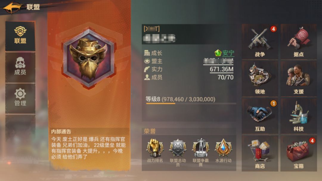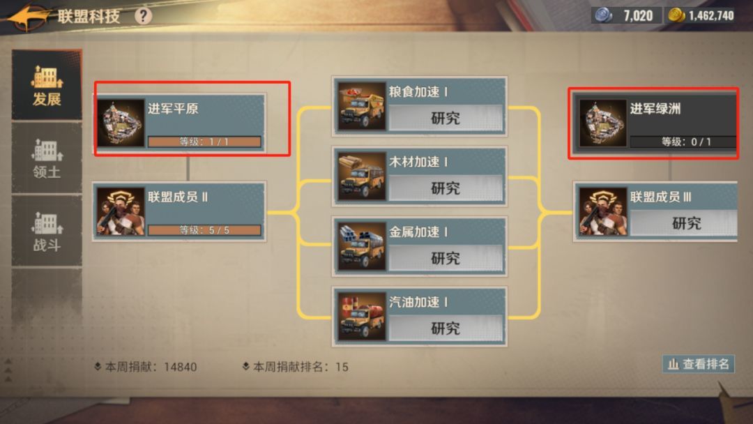 捐赠联盟科技,研究后除了能为全联盟玩家提升增益,也是我们从荒原进军平原地区再进军绿洲地区的基础。