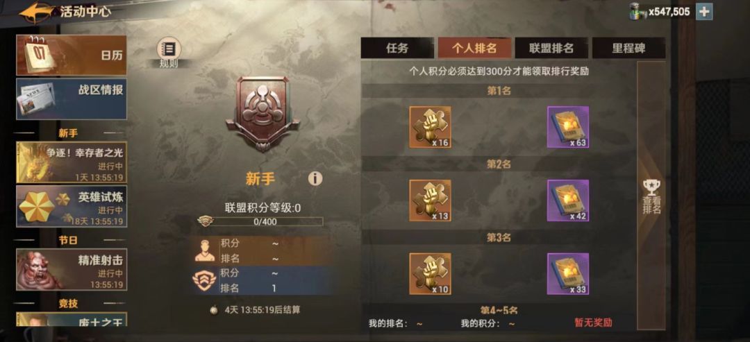 3、积极参与各项活动,尤其与联盟排名有关或需要联盟捐献道具开启的活动(1)联盟总动员以联盟为单位,每位成员完成不同等级的任务,可获得相应的积分,有个人奖励以及联盟排名奖励两种。由于每名成员基础可接的任务数量固定,且每天可额外接取的任务数量有限,想要让联盟排名和个人排名更靠前,需要全联盟的努力。
