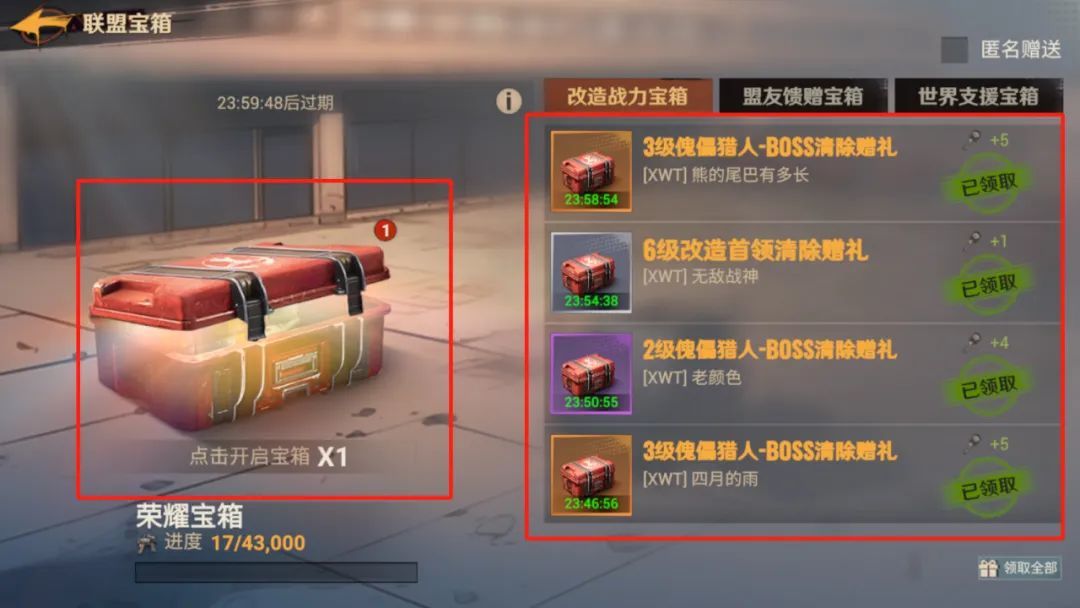 4、联盟宝箱多道具多攻击傀儡人,改造首领,亦或者是盟友购买了付费的道具,同联盟的成员都能领取宝箱中的赠礼。一个联盟活跃的人越多,参与打怪的人越多,再加上大佬的消费,我们能够领取的宝箱以及道具就越多。