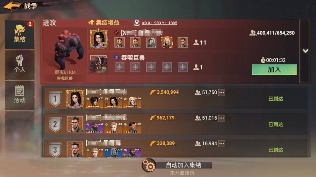 3、比伤害的活动有大佬带游戏中的很多活动能拿多少奖励,看得是大家造成的伤害,而联盟集结时,所有人进大佬的队伍后,吃的是大佬的buff加成,就算士兵数量不多或者自己英雄实力不够,也能造成单人作战时所达不到的伤害量。(比如毁灭降临活动,每天有固定进攻次数,奖励看伤害量来定,有大佬集结尽量别自己单打)