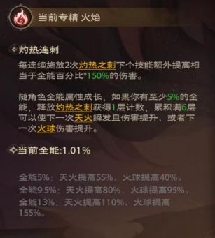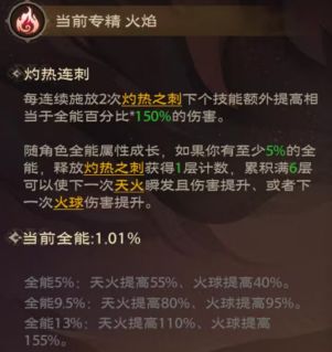 瞬发单体伤害技能,默认键位为2,点出天赋后充能3层,技能自带20%暴击率。拥有有5%以上全能时,累计6次灼热之刺后的火球或者天火会被强化。