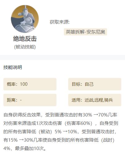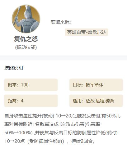 这个【复仇之怒】是雷欧尼达的自带技能,会在触发反击时有几率多打伤害和降低敌军的防御属性。然后【绝地反击】可以让自身获取反击状态,还有减伤的效果,搭配这个就可以更稳定的触发【复仇之怒】的效果。