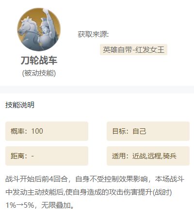 这两个技能搭配起来非常猛,他们分别是红发女王和乔瓦娜的自带技能。【刀轮战车】在发动主动技能后,会提升自身的攻击伤害,注意是可以无限叠加的!然后【万众一心】可以让我军在发动伤害类主动技能失败后有几率再尝试一次,大大增加了【刀轮战车】的触发几率,只需要随便再带2个伤害类的主动技能就可以打出爆炸伤害。