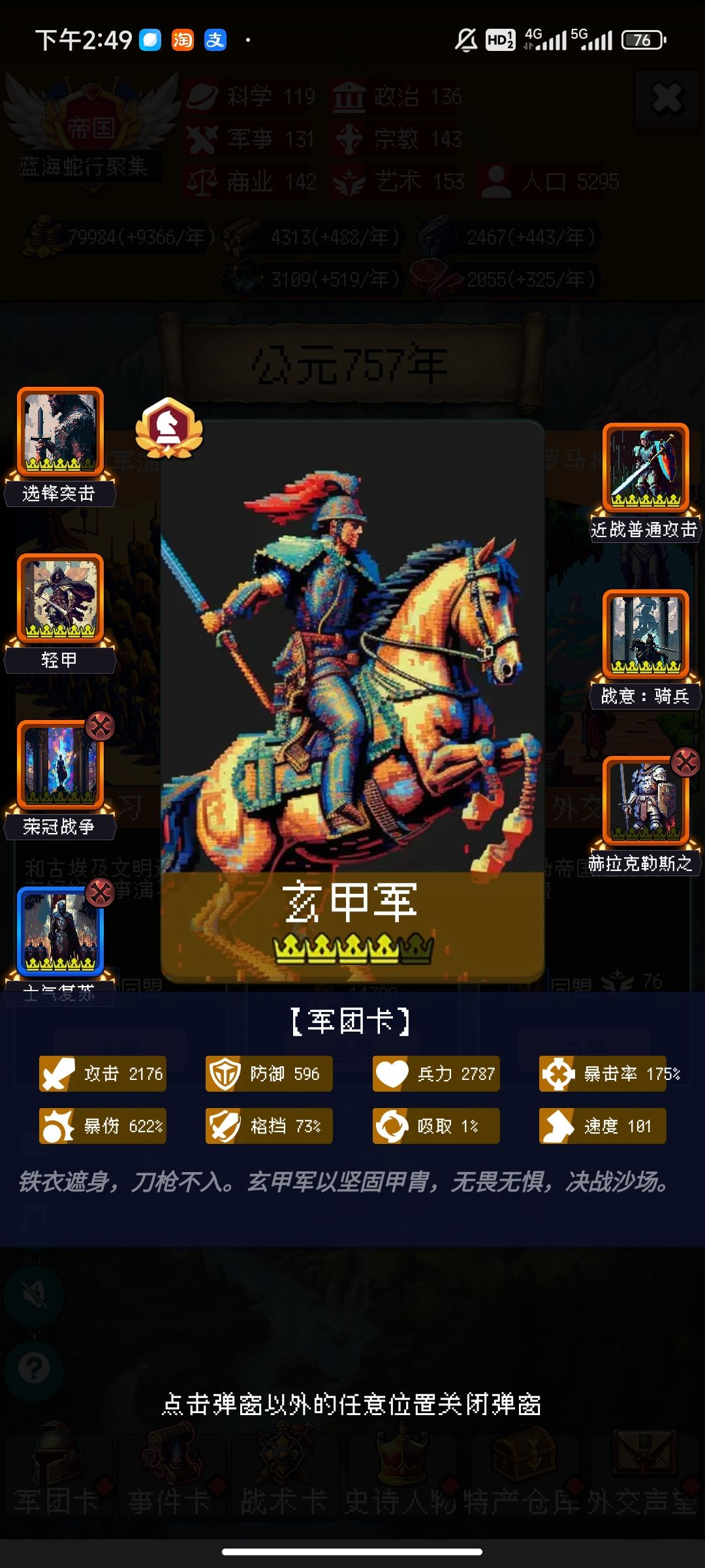 附:这把按照大佬的攻略拿到军功爵,奇袭拿到士气上扬,带个三一啥的就开始乱杀了,前期手术医生加秦骑圣骑秒,中期刮痧10个回合,300年后有士气上扬加针对要打的兵种配好技能,秦骑就可以一波流啦