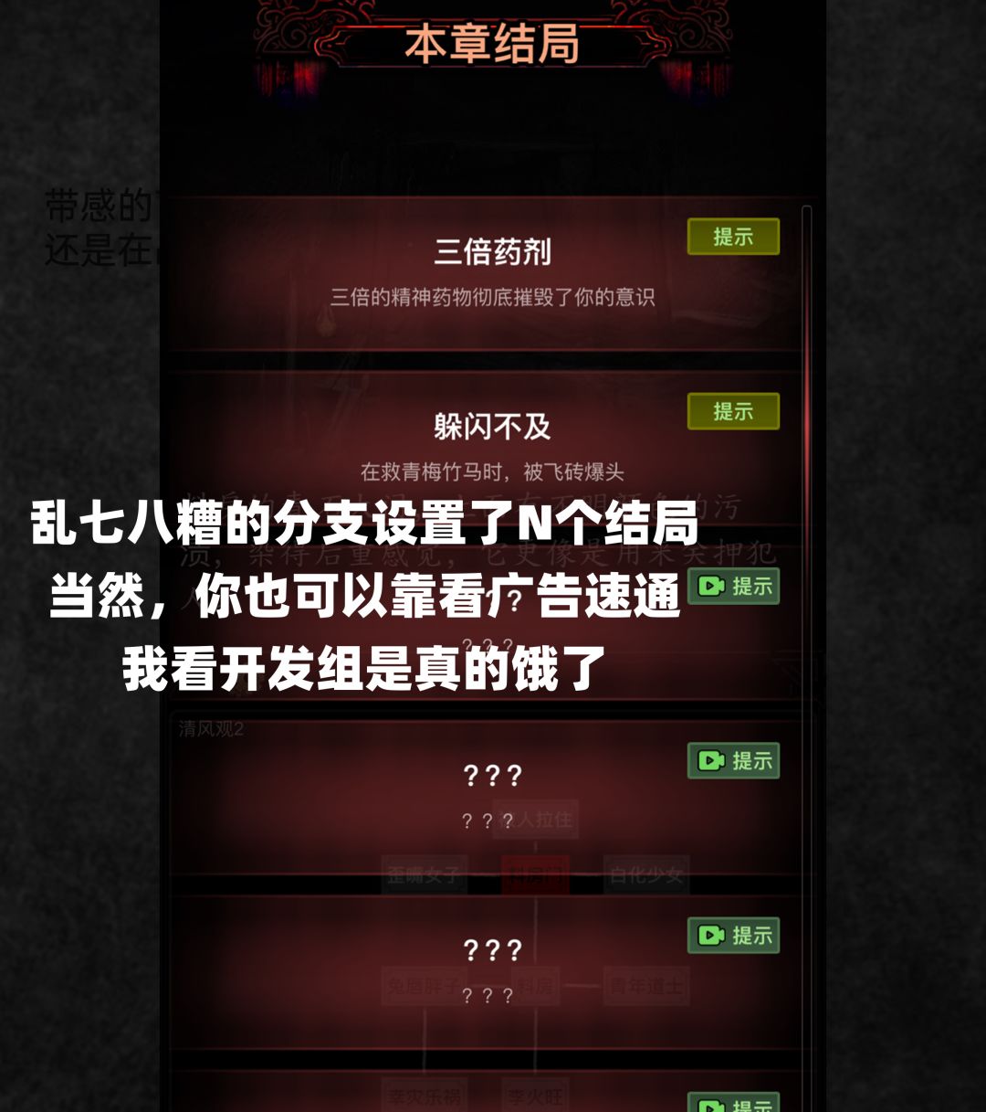 能感受到制作组可谓是想方设法的在每一个数值和按钮背后都塞进一个60秒的广告。当我以为剧情模式类似“带图小说”可以幸免于难时,发现章节里竟然设置了十几个结局成就,也可以通过广告速通…