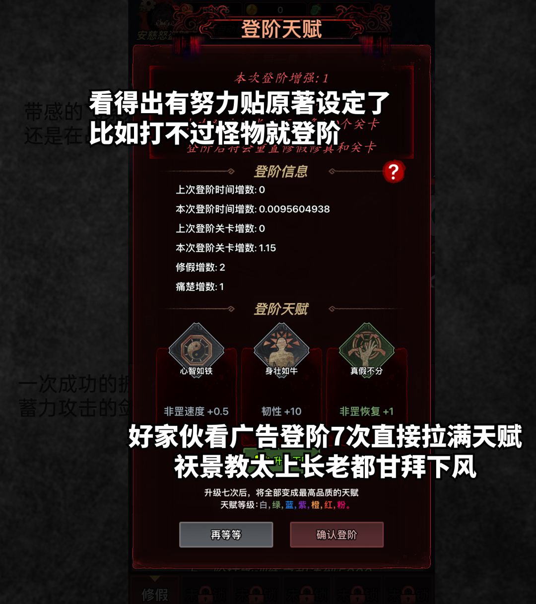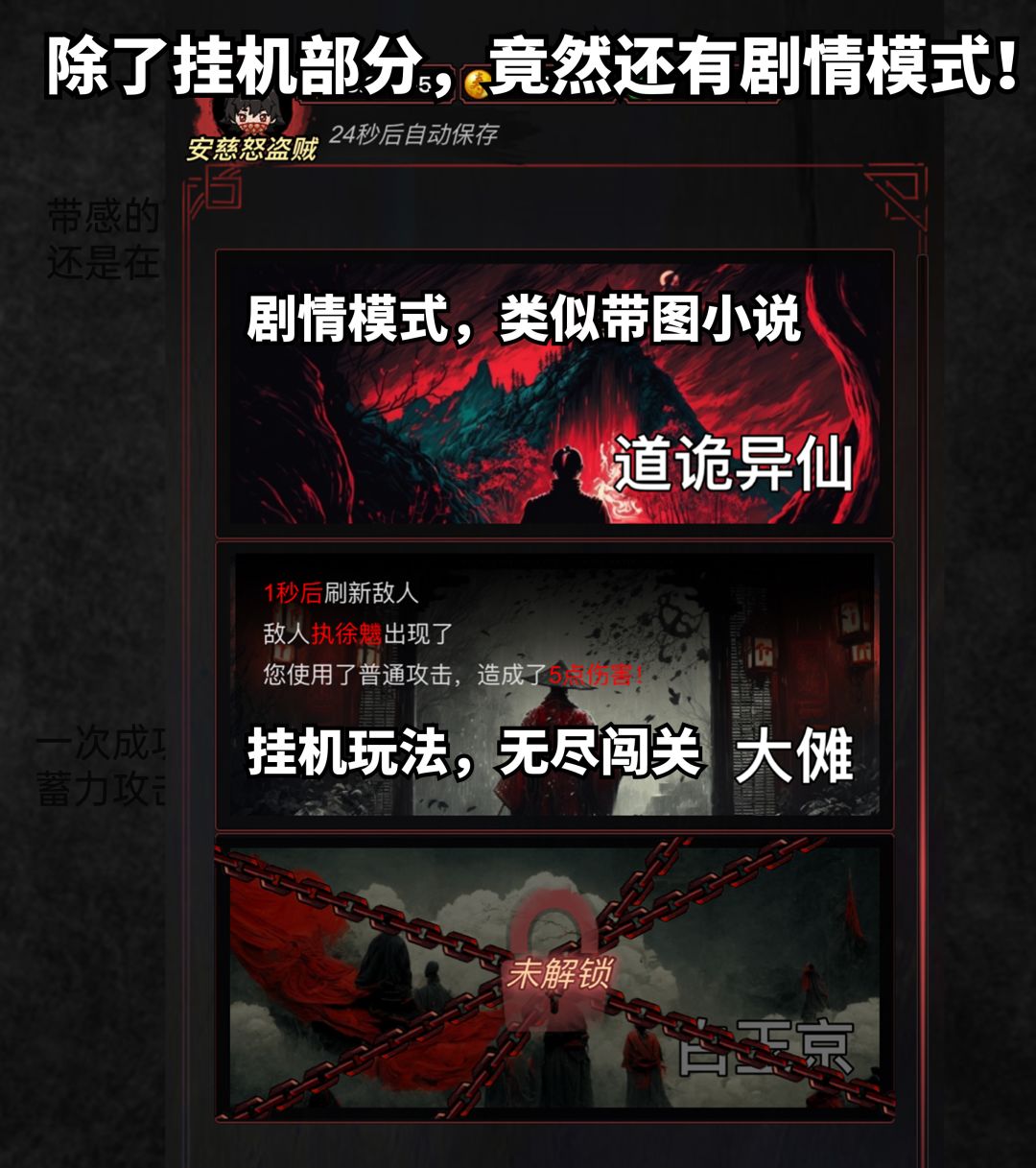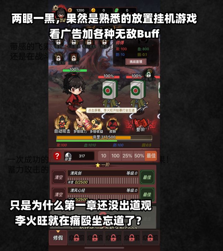 与其说是《道诡》手游,不如说是《道诡》广告模拟器,玩法无须多言,和类似的挂机放置游戏相差无几,只是它换皮加上了原著的设定。(所以对非原著党很不友好。应该搞不懂很多设定)。