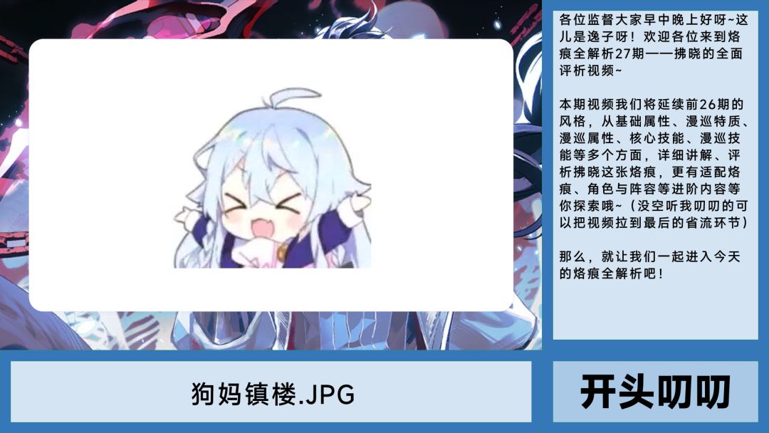 各位监督大家早中晚上好呀~这儿是逸子呀!欢迎各位来到烙痕全解析27期——拂晓的全面评析视频~