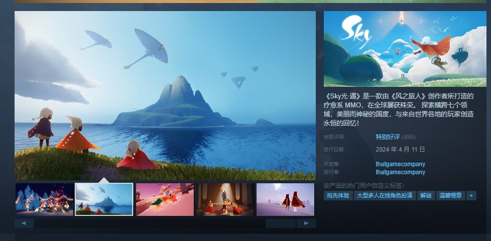 火了超级多年的光遇,继手游之后,终于上PC啦!《Sky 光遇》4月11日凌晨1点免费上架steam。《光遇(Sky: Children of the Light)》是一款由《风之旅人》创作者所打造的疗愈系MMO,在全球屡获殊荣,早在移动端就拥有着许多的忠实粉丝了,上线Steam后也喜迎了大批的玩家。