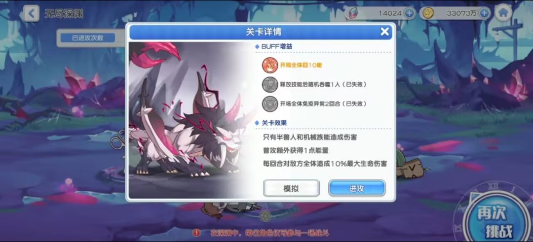 2、”释放技能随机吞噬一人“这个buff看情况打,深渊的怪物首回合都是有携带【钢化盾】(免疫控制二效果)的,首回合要么靠部分控制少女的概率破盾,要么就依赖减能让boss放不出技能,但boss只站在后排,如果它有队友的情况下,减能就难以实现了,【实验战士】只吸前排,首回合碰不到boss,所以在只有boss一只怪物,并且我方【实验战士】和【闪电流星】高星的情况下可以不打这个buff。这一期是没有小怪的,不过第一条buff的存在让我们无法通过减能让它释放不出技能,所以第一条和第二条只能选择一条打掉。这边的话陌陌选择的是打掉第二条buff。