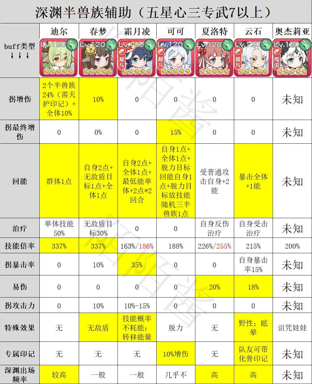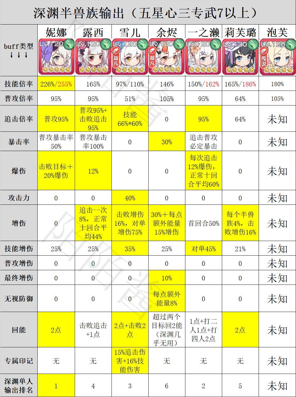 首先介绍一下半兽族的各个输出角色,以及她们在深渊中的各种增益buff。