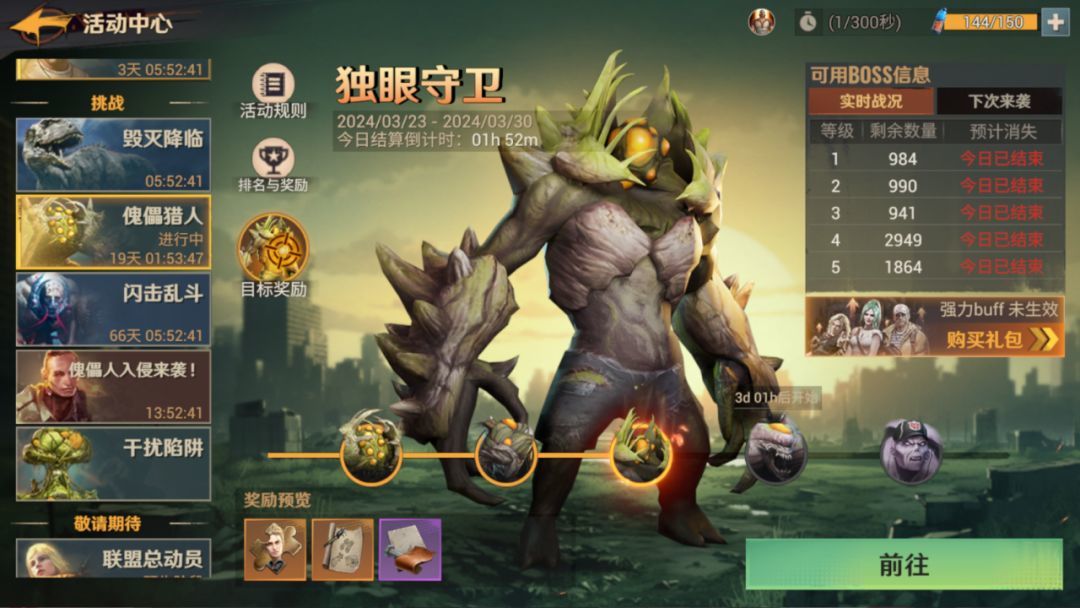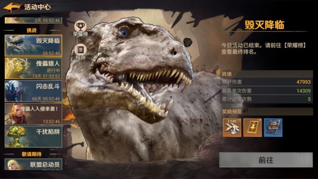 【毁灭降临】【傀儡猎人】是游戏中的常驻活动。其中【毁灭降临】会限制攻击次数,【傀儡猎人】则是有狩猎体力限制,两个活动都是既可以单人攻击,也可以联盟集结参与的。推荐加联盟蹭大佬的车,伤害更高奖励更多。