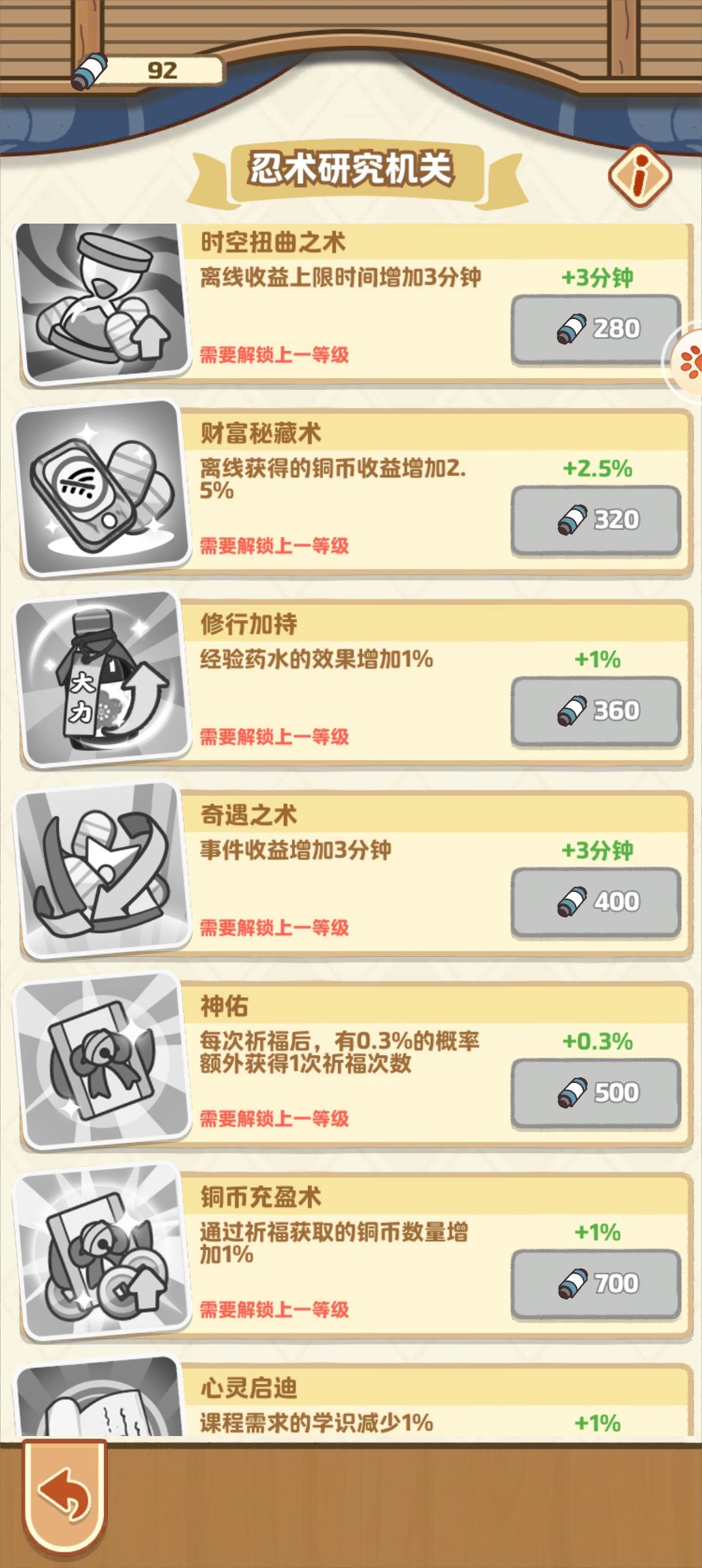当然,除了优先升级增加收益的忍术外,我们还需要根据自身当前的需求进行单一忍术的升级。比如,当我们需要提高学员的学习成功率时,可以针对性地升级一些与学业相关的忍术;当我们希望提升课程学费时,则可以选择升级一些与商业经营相关的忍术。